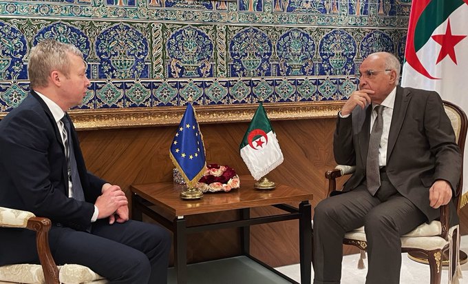 The Minister of Foreign Affairs and National Community Abroad, Ahmed Attaf, met with Sven Koopmans, the European Union Special Representative for the Middle East Peace Process, at the ministry’s headquarters on March 13.